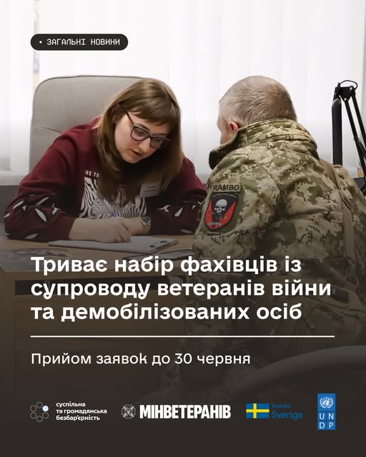 Триває прийом заяв на відбір на посади фахівця із супроводу ветеранів війни та демобілізованих осіб. Фахівець із супроводу — це перша особа, яка зустрічає наших Захисників і Захисниць після повернення в громаду, а також допомагає їхнім родинам та сім’ям полеглих героїв. Забезпечує інформаційний супровід та підтримку, консультує щодо отримання статусів, пільг, послуг, житла, проходження реабілітації, працевлаштування, започаткування власної справи, надає юридичну допомогу.