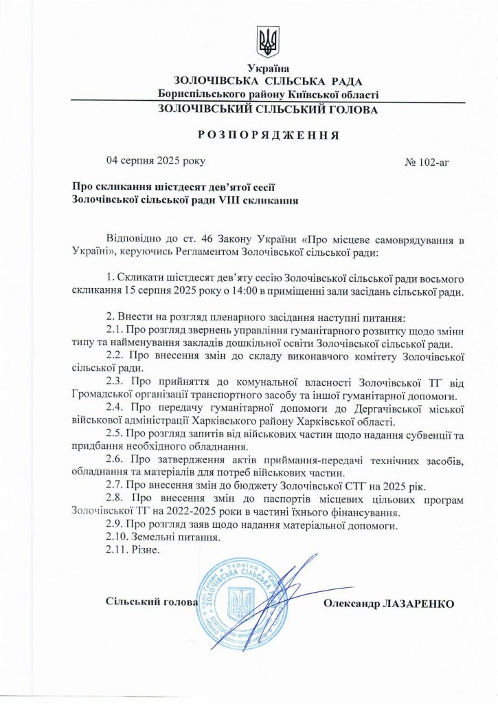 15 серпня 2025 року о 14:00 скликається 69 сесія Золочівської сільської ради