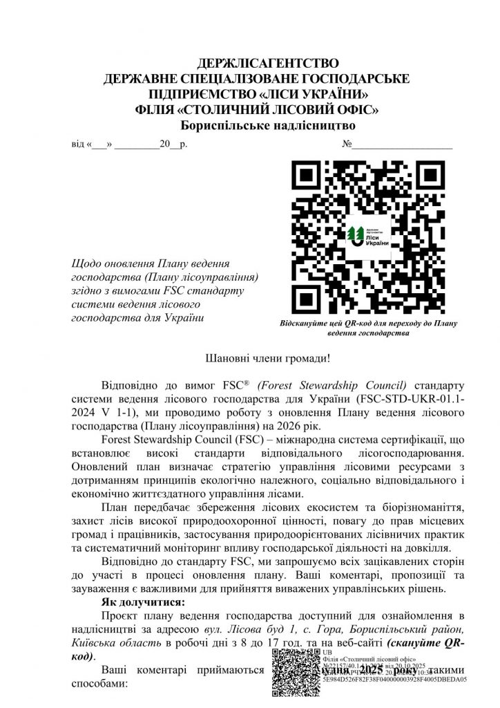Відповідно до вимог FSC® (Forest Stewardship Council) стандарту системи ведення лісового господарства для України (FSC-STD-UKR-01.1- 2024 V 1-1), ми проводимо роботу з оновлення Плану ведення лісового господарства (Плану лісоуправління) на 2026 рік. Forest Stewardship Council (FSC) – міжнародна система сертифікації, що встановлює високі стандарти відповідального лісогосподарювання.