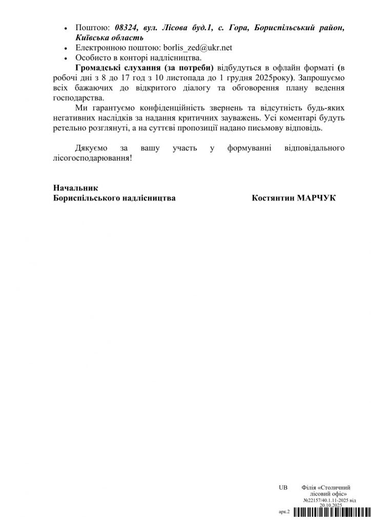 Громадські слухання (за потреби) відбудуться в офлайн форматі (в робочі дні з 8 до 17 год з 10 листопада до 1 грудня 2025року). Запрошуємо всіх бажаючих до відкритого діалогу та обговорення плану ведення господарства. Ми гарантуємо конфіденційність звернень та відсутність будь-яких негативних наслідків за надання критичних зауважень. Усі коментарі будуть ретельно розглянуті, а на суттєві пропозиції надано письмову відповідь.